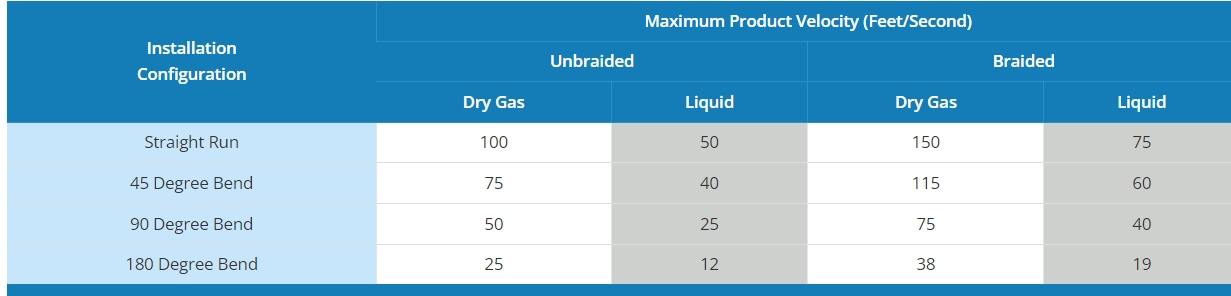 应使用衬垫的最小流速(以英尺/秒为单位)取决于几个变量,包括:a) 输送的介质,b) 组件中的任何弯曲,以及 c) 组件是编织的还是非编织的。根据 NAHAD 软管安全研究所手册,对于任何超过每秒 150 英尺的流速,都应在编织波纹组件(如果安装在输送干燥气体的直线装置中)中添加衬里。然而,推荐使用衬板的流速会随着上述变量的任何变化而显着下降。例如,如果未编织的软管在以 180 度角弯曲时输送液体,则需要流线管的速度会下降到每秒 12 英尺。